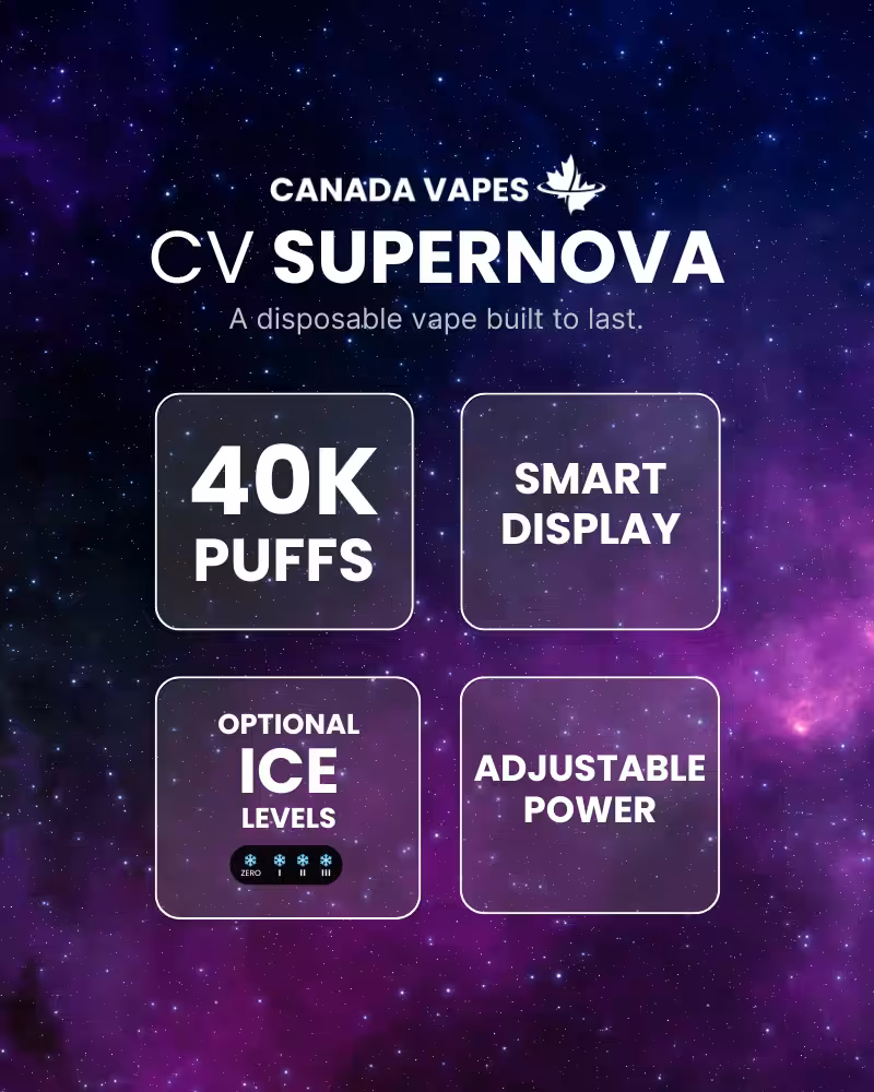 CV SUPERNOVA is Canada Vapesโ flagship 40K disposable built for real user control. Adjust the coolness across 4 ice levels, fine tune the draw with a 5-step airflow dial, and switch output with 3 power modes (Eco, Mid, Max). Triple mesh coils help keep flavour consistent, and the screen shows battery, e-liquid, ice level, and power mode so you are never guessing.