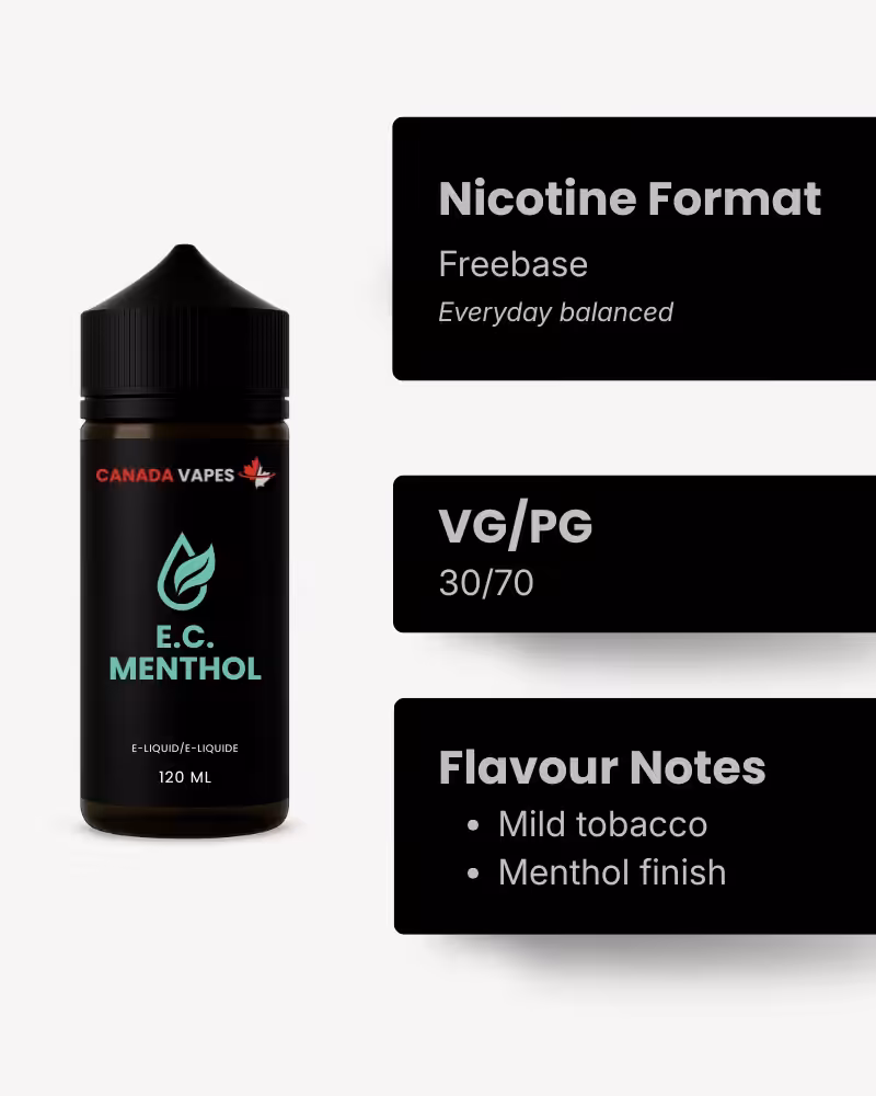 E.C Menthol is a Canadian-made e-liquid that builds on the same smooth, mild tobacco base as E.C Tobacco, with a menthol note added for a cleaner, cooler finish. The goal is not intensity. It is a balanced profile designed for adult vapers who want a straightforward tobacco style vape with a menthol layer that stays controlled and consistent from fill to fill.