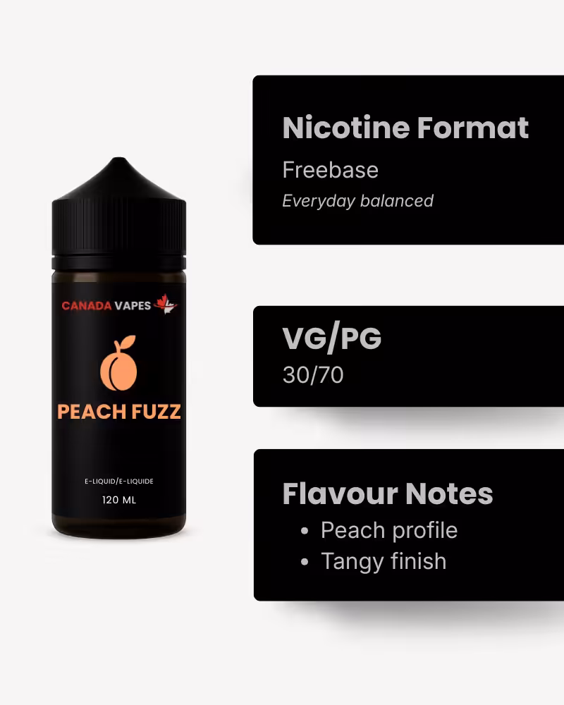 Peach Fuzz E-Liquid is crafted in London, Ontario, where Canada Vapes has been manufacturing high-quality e-liquids since 2010. This blend is built around the natural character of peach, offering a flavour that is smooth, balanced, and easy to enjoy.