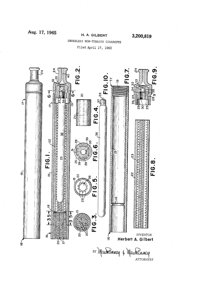 In 1963, inventor Herbert A. Gilbert filed a patent for a smokeless, non-tobacco cigarette that heated a flavoured liquid. It was never mass-produced, but the blueprint looked a lot like what we use now. His design is the stepping stone in the history of vaping.