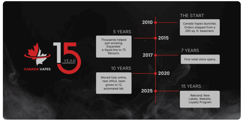 Canada Vapes was founded in 2010 as an online shop operating out of a 200 sq. ft. basement. The mission was simple. Make it easy for adult Canadians to buy genuine hardware and e-liquids with clear guidance. By 2015, the catalogue had grown across Canada, and the in-house e-liquid line reached 75 flavours. In 2017, the first retail store opened to complement the online service, providing local adults with a place to see devices in person and receive quick assistance.