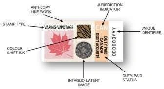 An excise stamp is a small stamp applied to the package. It shows the required vaping duty has been paid for the place where it will be sold. Canada has a federal vaping excise stamp, and some provinces also require their own stamp because they joined a coordinated system.