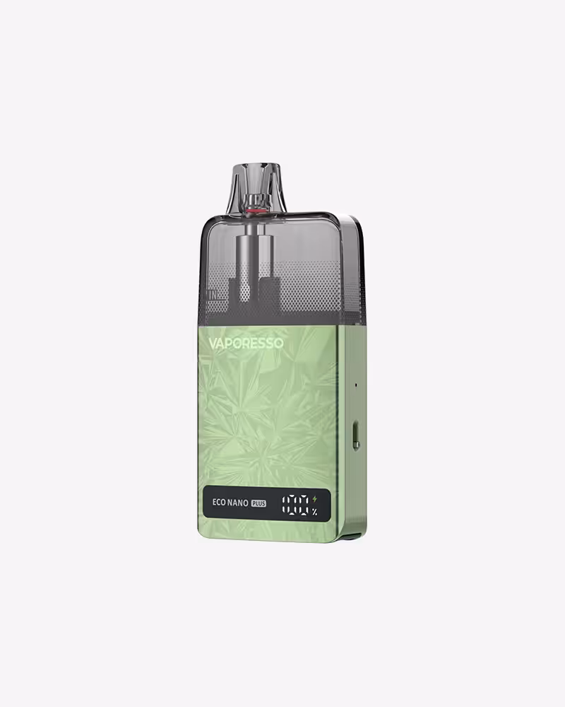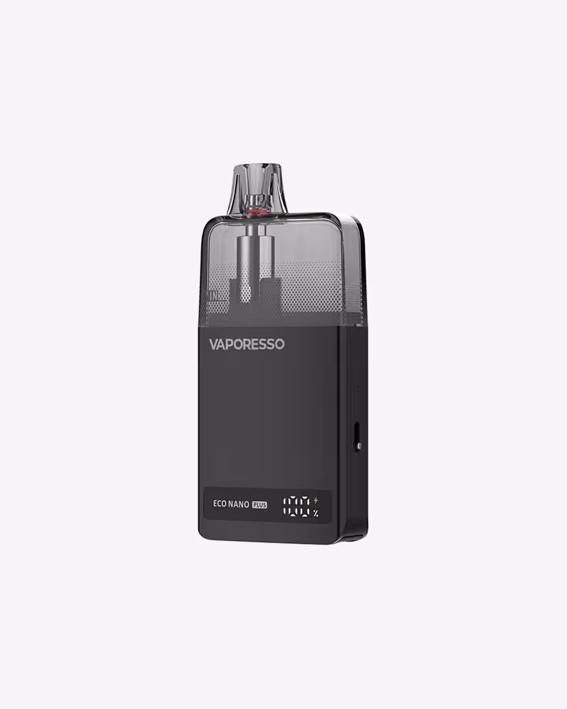 The Vaporesso Eco Nano Plus is a compact pod kit built for people who want long sessions with very little fuss. It combines a 10 ml refillable pod, a 1400 mAh built in battery, COREX Smooth Heating Technology, and a digital battery display in a small, pocket friendly body.